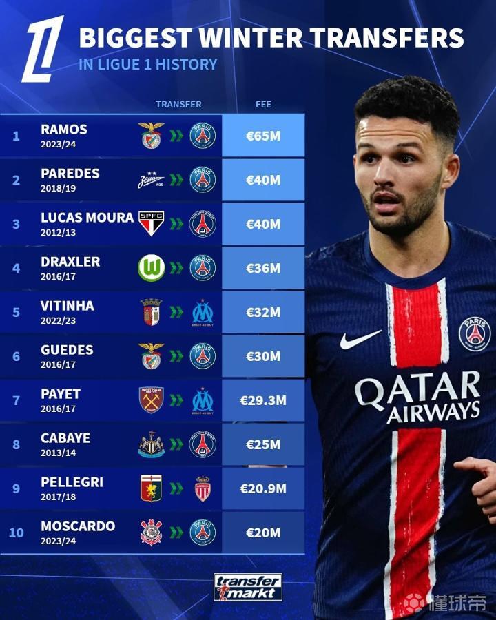 最近一份德国转会市场的统计报告展示了法甲联赛冬季转会窗口最贵的10笔转会。首位是贡萨洛-拉莫斯,他以6500万欧元的价格从本菲卡加盟了巴黎,成为这一榜单的头号球员。而巴黎这支球队在这份统计报告中名列前茅,共有7名球员跻身TOP10。